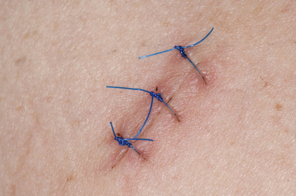 For surgical excisions on the face, sutures remain in place for about 7 days, while sutures for excisions on the chest, back, arms and legs remain for 10-14 days. The sutures provide support to the healing wound and it is best to prevent them from snapping by avoiding heavy lifting, exercise or overly strenuous activity. Avoiding tension on the suture and the wound is important for proper wound healing.